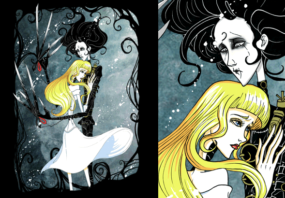 “Before he came down here, it never snowed. And afterwards, it did”. This design portrays both figures in a romantic and dark embrace under the snow.  I enjoy the treatment of the highly stylized hair leading to the winding frame.  The figures appear sad and feature elongated bodies creating a somber mood. The gothic, enlarged bladed-hands are almost as long as the figures for emphasis on the impossible touch.